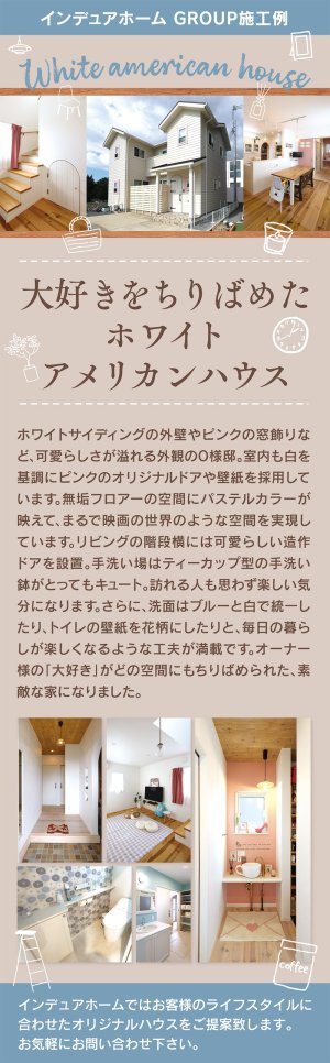 ホワイト外壁と可愛らしい看板が映えるアメリカンスタイルの住まい。吹き抜けのLDKやコの字型キッチン、家事動線にこだわった間取りで快適な暮らしを実現しています。